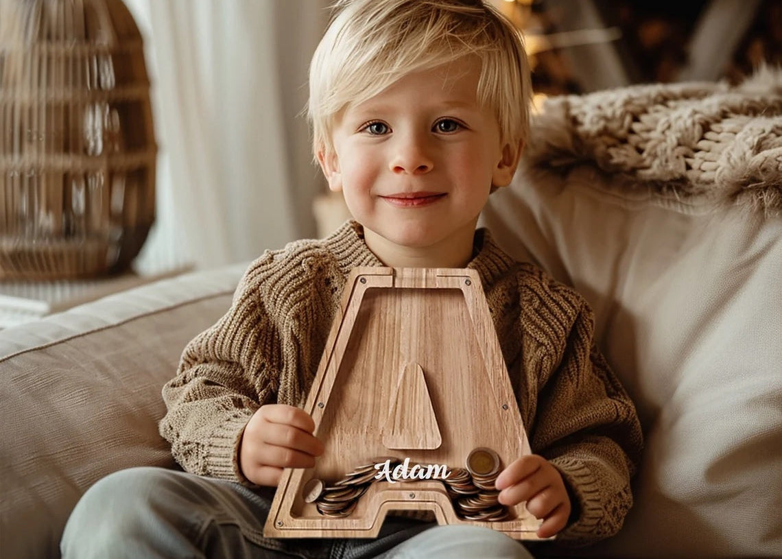 Wooden Alphabet Piggy Bank with Clear Acrylic Front A-Z Letters for Kids & Adults