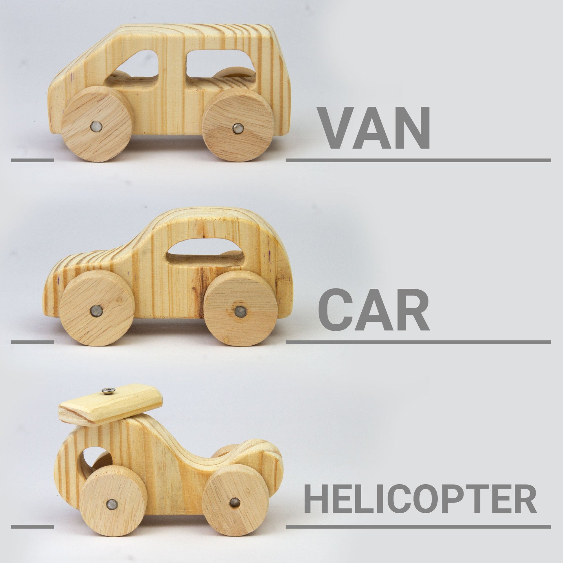 Natural Wooden Car, Van & Helicopter Toys Safe, Eco-Friendly, Educational Toy Set for Toddlers